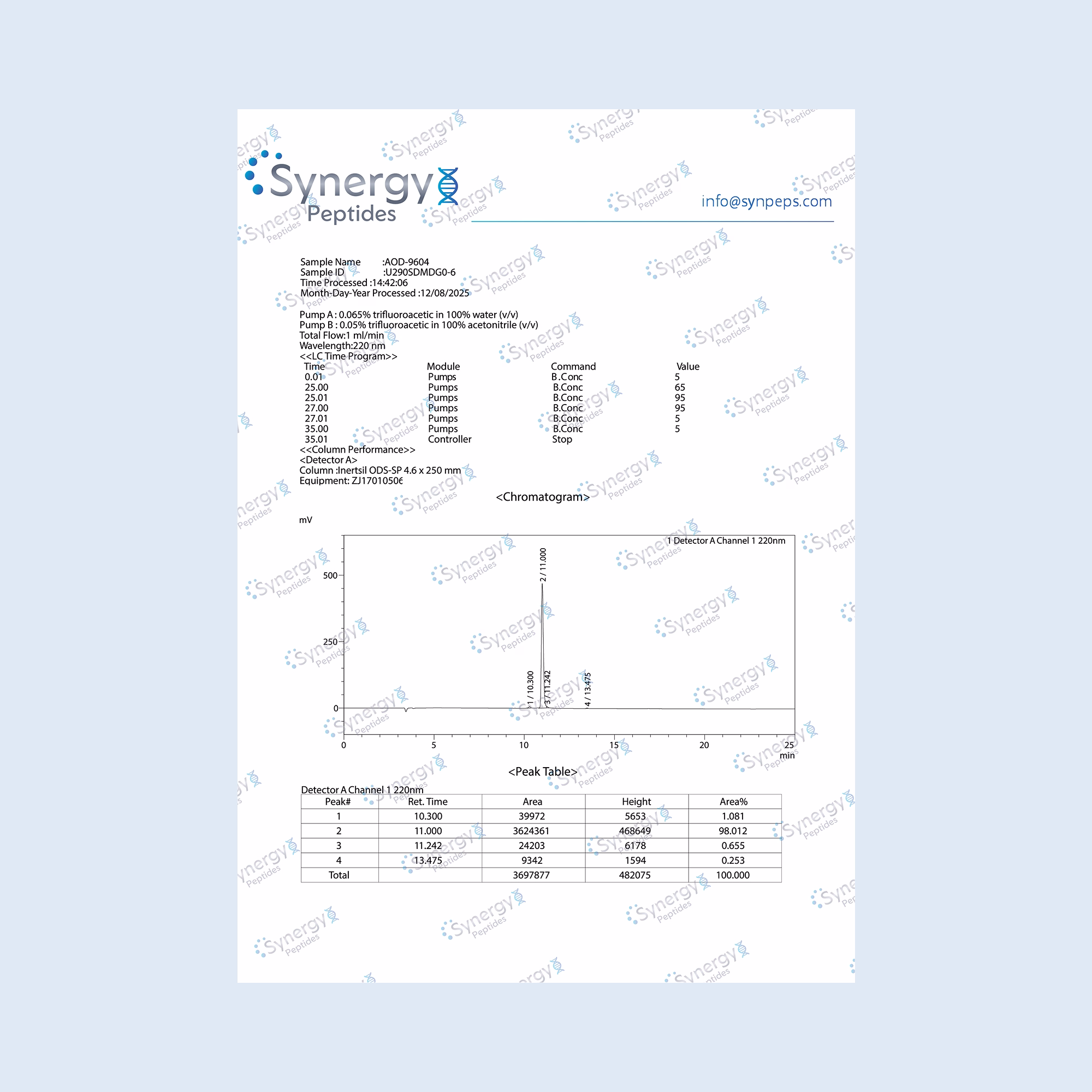 AOD-9604 is a synthetic peptide derived from the C-terminal fragment of human growth hormone (HGH). It is designed to support fat loss and metabolic health, particularly by stimulating lipolysis (fat breakdown) while minimizing the side effects of traditional HGH therapies.