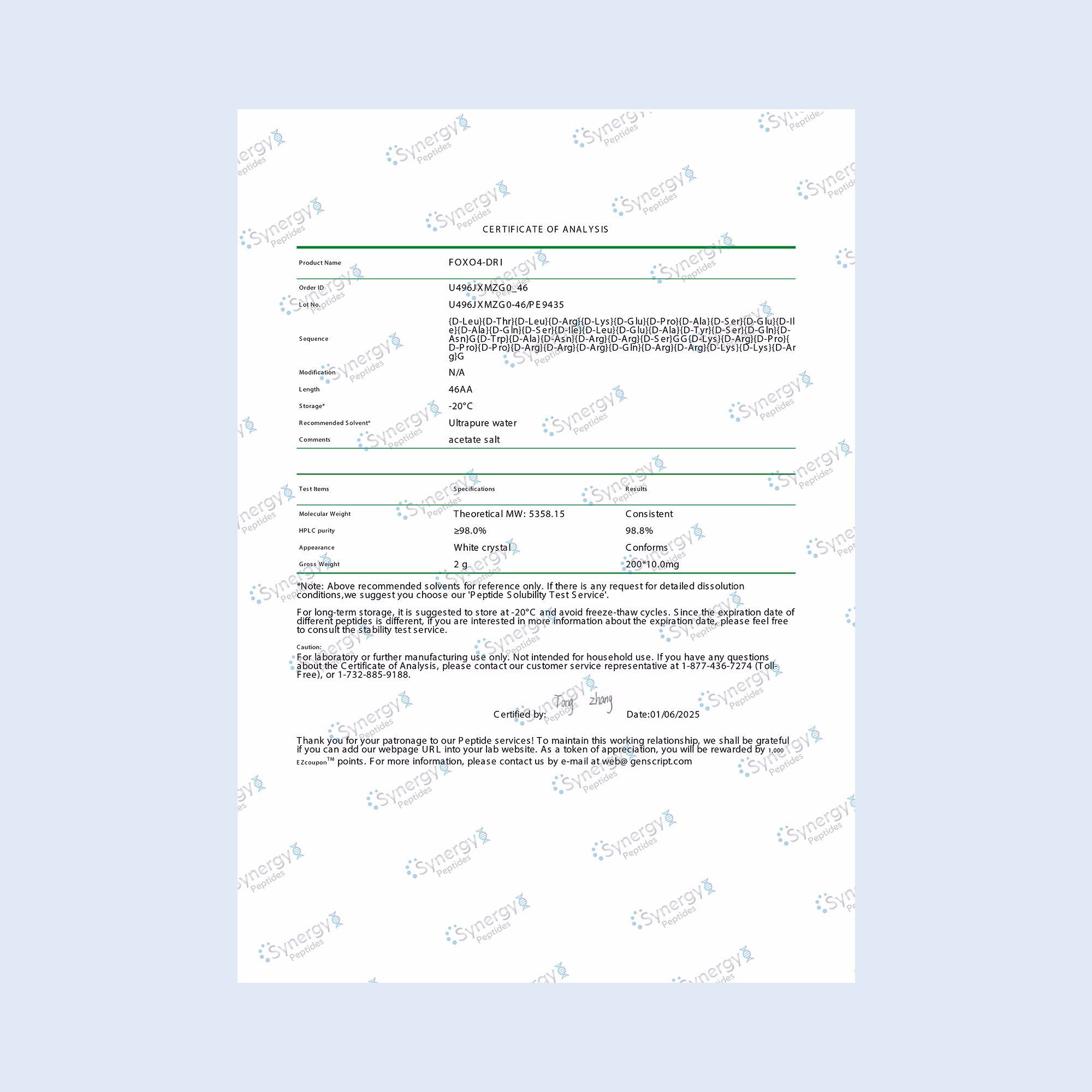 FOX04 DRI (Fork Head Box O4 "D Retro Inverso") is an advanced peptide that targets cellular senescence, a process where cells lose their ability to function and divide. This synthetic peptide is a mirror-image version of the naturally occurring FOXO4 protein, designed to resist enzymatic degradation and remain effective in the body for longer periods. By modulating FOXO4 activity, FOX04 DRI promotes healthier aging and cellular regeneration.