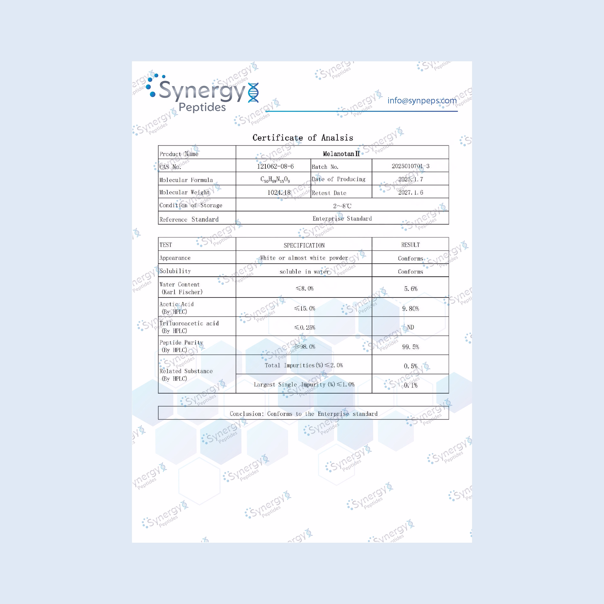 Melanotan 2 is a synthetic peptide that mimics the effects of alpha-melanocyte-stimulating hormone (α-MSH), a natural hormone involved in regulating skin pigmentation. By stimulating melanocytes (the cells responsible for producing melanin), Melanotan 2 induces tanning of the skin without the need for sun exposure, providing a safe and effective way to achieve a darker skin tone.