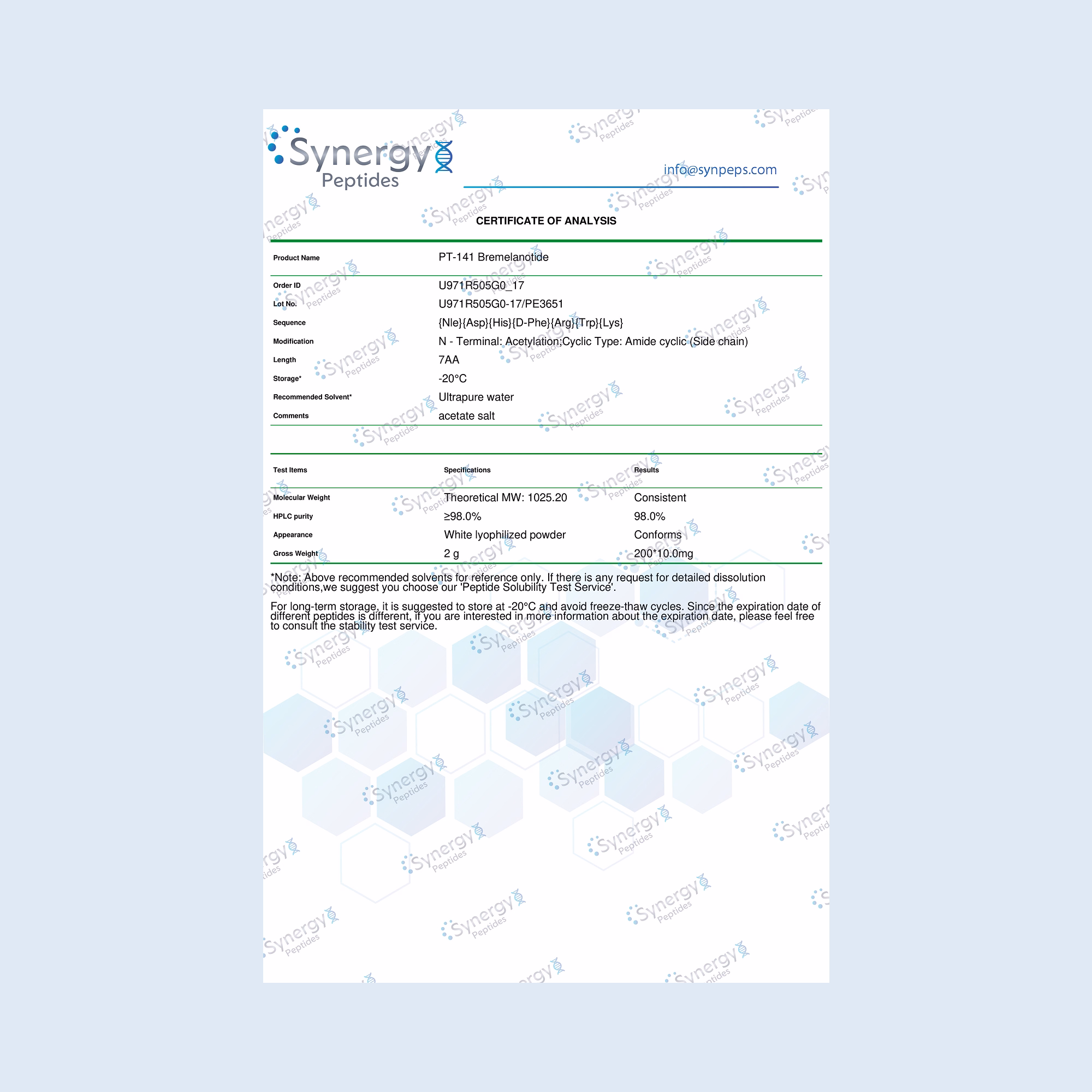 PT-141, also known as Bremelanotide, is a synthetic peptide primarily used to treat sexual dysfunction in both men and women. Unlike traditional treatments that focus on improving blood flow to the genital area, PT-141 works by activating melanocortin receptors in the brain, which regulate sexual arousal and desire. This central mechanism makes it an effective solution for enhancing libido and addressing sexual arousal disorders (SIAD) and erectile dysfunction (ED).